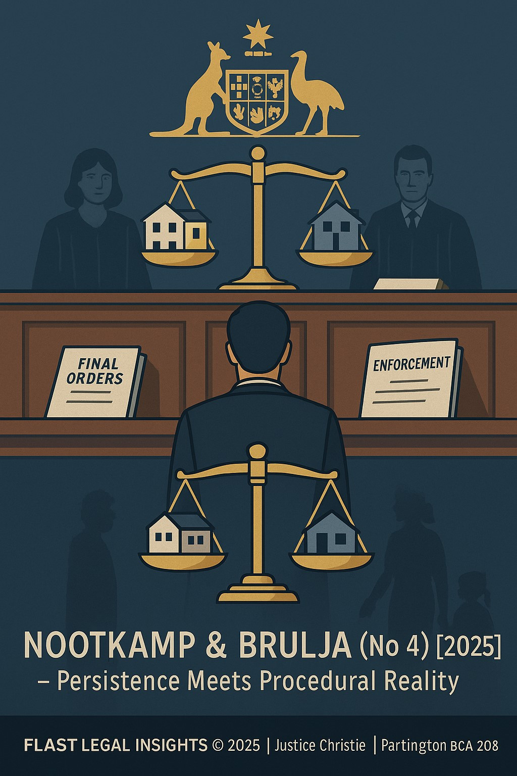 In Nootkamp & Brulja (No 4) [2025] FedCFamC1A 210, the Full Court of the Federal Circuit and Family Court of Australia (Division 1) dismissed a husband’s fourth attempt to overturn enforcement orders made to implement final property settlement orders from 2024. The self-represented appellant alleged judicial bias, procedural unfairness, and discretionary error, but the Full Court (Austin, Sutherland & Riethmuller JJ) found that he was simply re-litigating issues already determined and had been given ample opportunity to comply with the original orders. The Court reinforced the narrow grounds for alleging bias and the high threshold for obtaining leave to appeal interlocutory property orders.