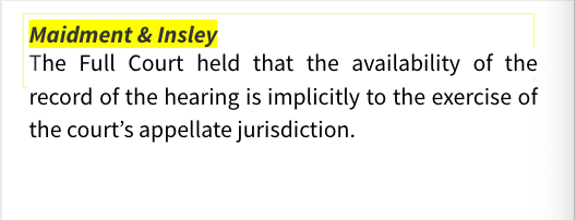 Maidment & Insley [2022] FedCFamC1A 48 - where the Full Court held that the availability of the record of the hearing is implicitly to the exercise of the court’s appellate jurisdiction.