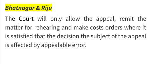 Bhatnagar & Riju [2018] FamCAFC 144 - provides that the Court will only allow the appeal, remit the matter for rehearing and make costs orders where it is satisfied that the decision the subject of the appeal is affected by appealable error.