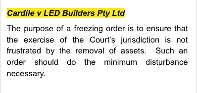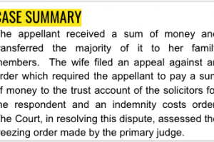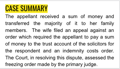 The appellant received a sum of money and transferred the majority of it to her family members. The wife filed an appeal against an order which required the appellant to pay a sum of money to the trust account of the solicitors for the respondent and an indemnity costs order. The Court, in resolving this dispute, assessed the freezing order made by the primary judge.