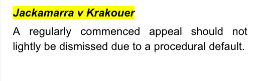 Jackamarra v Krakouer (1998) 195 CLR 516; [1998] HCA 27 - provides that a regularly commenced appeal should not lightly be dismissed due to a procedural default.