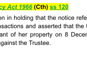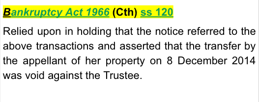Bankruptcy Act 1966 (Cth) ss 120 - relied upon in holding that the notice referred to the above transactions and asserted that the transfer by the appellant of her property on 8 December 2014 was void against the Trustee.