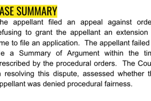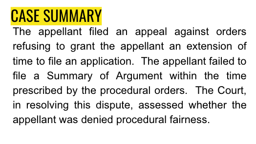 The appellant filed an appeal against orders refusing to grant the appellant an extension of time to file an application. The appellant failed to file a Summary of Argument within the time prescribed by the procedural orders. The Court, in resolving this dispute, assessed whether the appellant was denied procedural fairness.