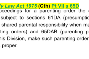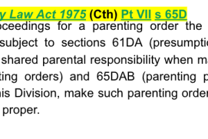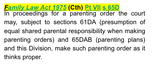 Family Law Act 1975 (Cth) Pt VII s 65D - provides that in proceedings for a parenting order the court may, subject to sections 61DA (presumption of equal shared parental responsibility when making parenting orders) and 65DAB (parenting plans) and this Division, make such parenting order as it thinks proper.