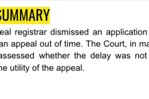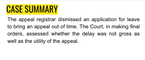 The appeal registrar dismissed an application for leave to bring an appeal out of time. The Court, in making final orders, assessed whether the delay was not gross as well as the utility of the appeal.