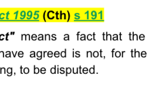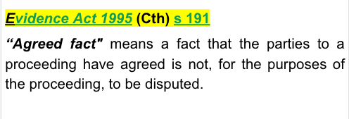 Evidence Act 1995 (Cth) s 191 - provides that "agreed fact" means a fact that the parties to a proceeding have agreed is not, for the purposes of the proceeding, to be disputed.