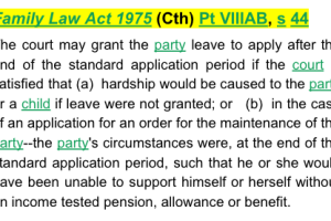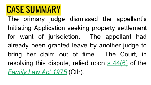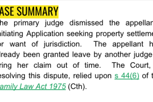 The primary judge dismissed the appellant’s Initiating Application seeking property settlement for want of jurisdiction. The appellant had already been granted leave by another judge to bring her claim out of time. The Court, in resolving this dispute, relied upon s 44(6) of the Family Law Act 1975 (Cth).