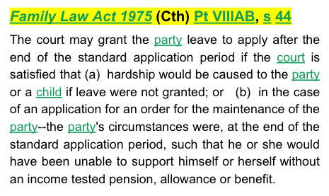 Even on the appellant’s best case, her application for property settlement relief filed in August 2017 was brought outside the limitation period and so the first form of relief she sought was the grant of permission under s 44(6) of the Act to bring her claim out of time.