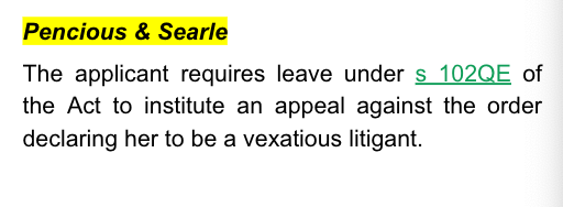 This application is being heard without an oral hearing (s 102QF(3)), despite the applicant indicating in her application that she did not want the application determined on the papers in her absence. His Honour correctly referred to decisions concerning the power to prohibit vexatious proceedings and s 102QB of the Act, which have been widely relied upon in the interpretation of s 102Q.