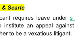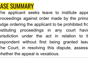 The applicant seeks leave to institute appeal proceedings against order made by the primary judge ordering the applicant to be prohibited from instituting proceedings in any court having jurisdiction under the act in relation to the respondent without first being granted leave. The Court, in resolving this dispute, assessed whether the appeal is vexatious.