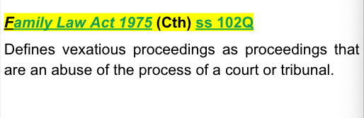 Family Law Act 1975 (Cth) ss 102Q - defines vexatious proceedings as proceedings that are an abuse of the process of a court or tribunal.