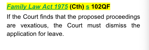 Family Law Act 1975 (Cth) s 102QF - provides that if the Court finds that the proposed proceedings are vexatious, the Court must dismiss the application for leave.