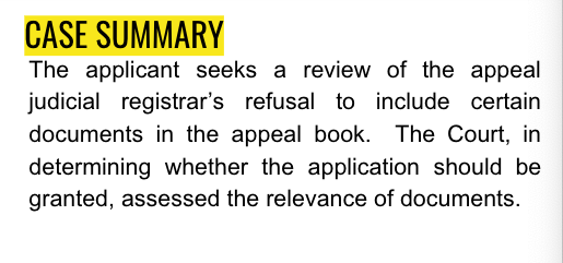 The applicant seeks a review of the appeal judicial registrar’s refusal to include certain documents in the appeal book. The Court, in determining whether the application should be granted, assessed the relevance of documents.
