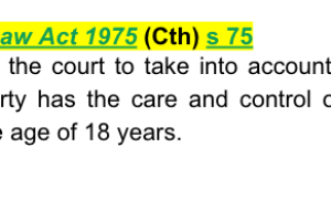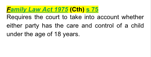Family Law Act 1975 (Cth) s 75 - requires the court to take into account whether either party has the care and control of a child under the age of 18 years.