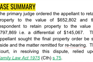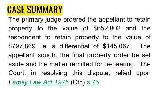 The primary judge ordered the appellant to retain property to the value of $652,802 and the respondent to retain property to the value of $797,869 i.e. a differential of $145,067. The appellant sought the final property order be set aside and the matter remitted for re-hearing. The Court, in resolving this dispute, relied upon Family Law Act 1975 (Cth) s 75.