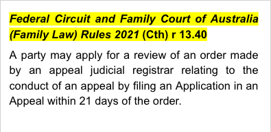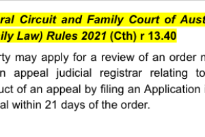 The effect of these orders was that the appeal would be stayed if the applicant failed to pay $30,000 as security for the respondent’s costs of appeal. The applicant did not provide the security as ordered. On 20 June 2022, the appeal judicial registrar dismissed the applicant’s appeal, pursuant to s 32(3)(f)(i) of the Federal Circuit and Family Court of Australia Act 2021 (Cth) and ordered her to pay the respondent’s costs fixed at the sum of $7,000. On 24 December 2019, McClelland DCJ made final property orders between the parties. Those orders were the subject of an appeal which was dismissed.