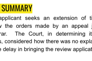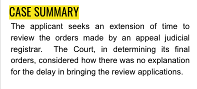 The applicant seeks an extension of time to review the orders made by an appeal judicial registrar. The Court, in determining its final orders, considered how there was no explanation for the delay in bringing the review applications.