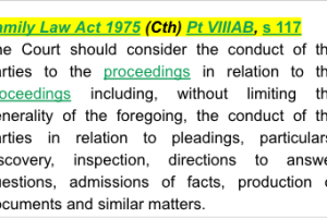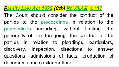 Family Law Act 1975 (Cth) Pt VIIIAB, s 117 - provides that that the Court should consider the conduct of the parties to the proceedings in relation to the proceedings including, without limiting the generality of the foregoing, the conduct of the parties in relation to pleadings, particulars, discovery, inspection, directions to answer questions, admissions of facts, production of documents and similar matters.