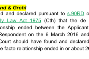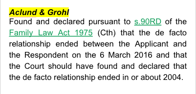 Aclund & Grohl [2019] FamCAFC 69 - found and declared pursuant to s.90RD of the Family Law Act 1975 (Cth) that the defacto relationship ended between the Applicant and the Respondent on the 6 March 2016 and that the Court should have found and declared that the defacto relationship ended in or about 2004.