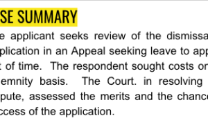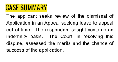 The applicant seeks review of the dismissal of Application in an Appeal seeking leave to appeal out of time. The respondent sought costs on an indemnity basis. The Court. in resolving this dispute, assessed the merits and the chance of success of the application.
