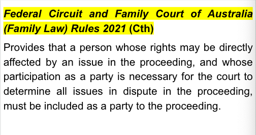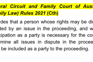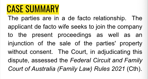 The parties are in a de facto relationship. The applicant de facto wife seeks to join the company to the present proceedings as well as an injunction of the sale of the parties' property without consent. The Court, in adjudicating this dispute, assessed the Federal Circuit and Family Court of Australia (Family Law) Rules 2021 (Cth).