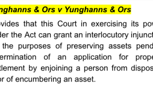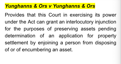 It was said on behalf of the respondents that a failure by the de facto wife to both nominate a correct section of the Act and, more particularly, to name the company as a respondent to the de facto wife's Amended Initiating Application for property settlement and to seek orders specifically in relation to the property at C Street, Suburb D was fatal to the application for interim injunctive relief as against the company. The injunctive relief sought by the de facto wife's Application in a Proceeding was that the property at C Street, Suburb D not be sold without the written consent of the parties or order of the Court.