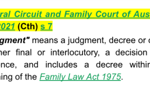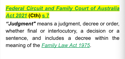 Family Law Act 1975 (Cth) Pt X, s 4 - provides that “decree” means decree, judgment or order and includes:
