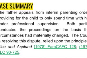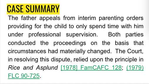 The father appeals from interim parenting orders providing for the child to only spend time with him under professional supervision. Both parties conducted the proceedings on the basis that circumstances had materially changed. The Court, in resolving this dispute, relied upon the principle in Rice and Asplund [1978] FamCAFC 128; (1979) FLC 90-725.