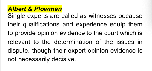 Albert & Plowman [2020] FamCAFC 23 - provides that single experts are called as witnesses because their qualifications and experience equip them to provide opinion evidence to the court which is relevant to the determination of the issues in dispute, though their expert opinion evidence is not necessarily decisive.