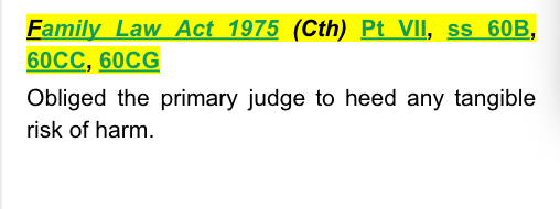 Family Law Act 1975 (Cth) Pt VII, ss 60B, 60CC, 60CG - obliged the primary judge to heed any tangible risk of harm.