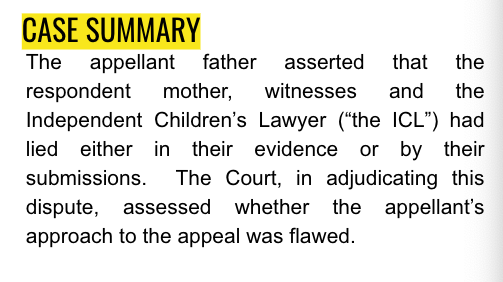 The appellant father asserted that the respondent mother, witnesses and the Independent Children’s Lawyer (“the ICL”) had lied either in their evidence or by their submissions. The Court, in adjudicating this dispute, assessed whether the appellant’s approach to the appeal was flawed.