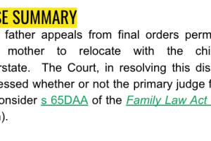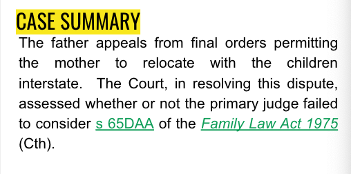 The father appeals from final orders permitting the mother to relocate with the children interstate. The Court, in resolving this dispute, assessed whether or not the primary judge failed to consider s 65DAA of the Family Law Act 1975 (Cth).