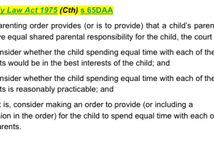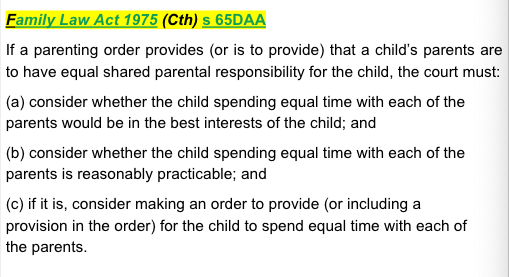 Family Law Act 1975 (Cth) s 65DAA - provides that if a parenting order provides (or is to provide) that a child’s parents are to have equal shared parental responsibility for the child, the court must: