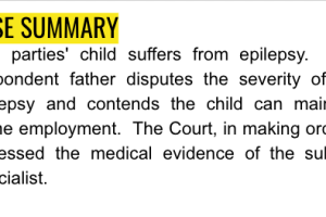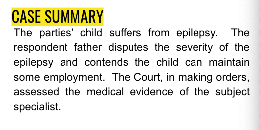 The parties' child suffers from epilepsy. The respondent father disputes the severity of the epilepsy and contends the child can maintain some employment. The Court, in making orders, assessed the medical evidence of the subject specialist.