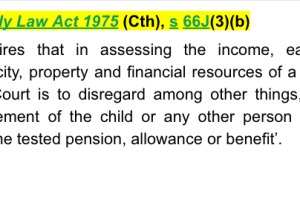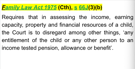 Family Law Act 1975 (Cth), s 66J(3)(b) - requires that in assessing the income, earning capacity, property and financial resources of a child, the Court is to disregard among other things, ‘any entitlement of the child or any other person to an income tested pension, allowance or benefit’.