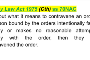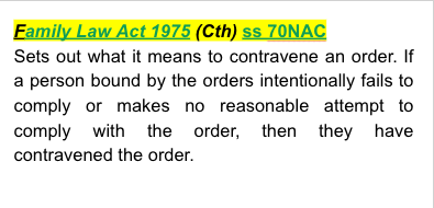 Family Law Act 1975 (Cth) ss 70NAC - sets out what it means to contravene an order. If a person bound by the orders intentionally fails to comply or makes no reasonable attempt to comply with the order, then they have contravened the order.