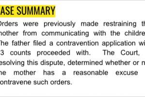 Orders were previously made restraining the mother from communicating with the children. The father filed a contravention application with 53 counts proceeded. The Court, in resolving this dispute, determined whether or not the mother has a reasonable excuse to contravene such orders.