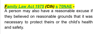 Family Law Act 1975 (Cth) s 70NAE - provides that a person may also have a reasonable excuse if they believed on reasonable grounds that it was necessary to protect theirs or the child’s health and safety.