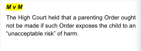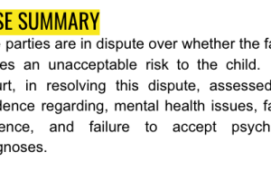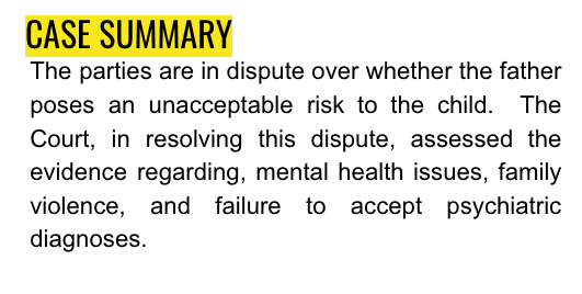 The parties are in dispute over whether the father poses an unacceptable risk to the child. The Court, in resolving this dispute, assessed the evidence regarding, mental health issues, family violence, and failure to accept psychiatric diagnoses.