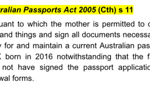 Australian Passports Act 2005 (Cth) s 11 - pursuant to which the mother is permitted to do all acts and things and sign all documents necessary to apply for and maintain a current Australian passport for X born in 2016 notwithstanding that the father may not have signed the passport application or renewal forms.