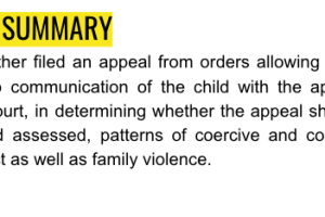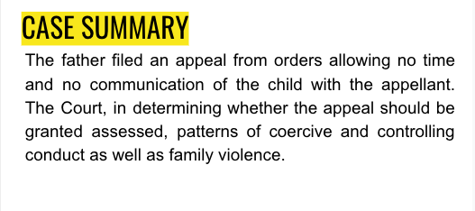 The father filed an appeal from orders allowing no time and no communication of the child with the appellant. The Court, in determining whether the appeal should be granted assessed, patterns of coercive and controlling conduct as well as family violence.