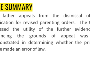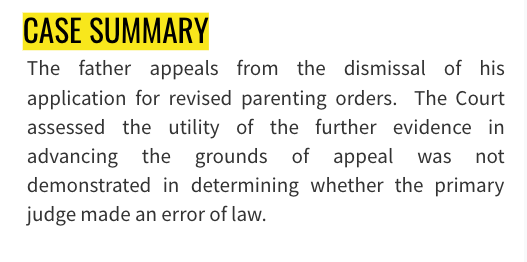 The father appeals from the dismissal of his application for revised parenting orders. The Court assessed the utility of the further evidence in advancing the grounds of appeal was not demonstrated in determining whether the primary judge made an error of law.
