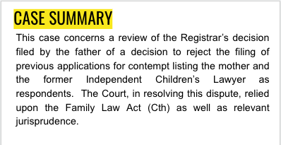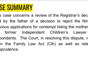 This case concerns a review of the Registrar’s decision filed by the father of a decision to reject the filing of previous applications for contempt listing the mother and the former Independent Children’s Lawyer as respondents. The Court, in resolving this dispute, relied upon the Family Law Act (Cth) as well as relevant jurisprudence.