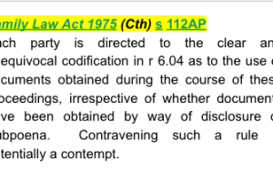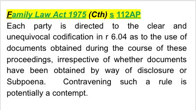 Family Law Act 1975 (Cth) s 112AP - provides that each party is directed to the clear and unequivocal codification in r 6.04 as to the use of documents obtained during the course of these proceedings, irrespective of whether documents have been obtained by way of disclosure or Subpoena. Contravening such a rule is potentially a contempt.