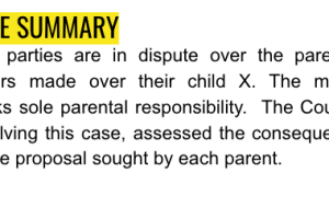 On 29 May 2020, orders were made dismissing the Mother’s application, inter alia, that the Father cause the child to be relocated back to the Sydney metropolitan area. This application had been made by the Mother by reason of the relocation of the child’s residence to the Area B by the Father. The mother sought that she have sole parental responsibility of the Child and that the child live with the mother.