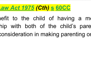 Family Law Act 1975 (Cth) s 60CC - provides that the benefit to the child of having a meaningful relationship with both of the child’s parents is a primary consideration in making parenting orders.