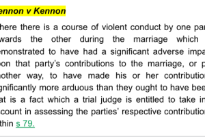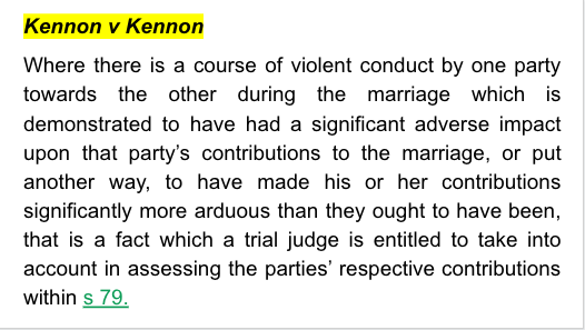 The primary judge determined the parties' respective contribution based entitlements at 55/45 in the wife's favour, and assessed the factors listed in s 75(2) of the Family Law Act 1975 (Cth) as favouring the wife, with an adjustment of 6 per cent reflective of that. The husband asserts that the learned trial judge erred in considering the Kennon argument independent of the other contributions of the parties and the learned trial judge gave inadequate reasons as to why it was just and equitable to make an adjustment of 5% in favour of the wife. The wife contended that the husband's family violence made her contributions more onerous, and thereby called in aid of her case the principles espoused in the decision of Kennon v Kennon [1997] FamCA 27; (1997) FLC 92-757 (“Kennon”).