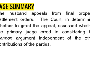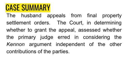 The husband appeals from final property settlement orders. The Court, in determining whether to grant the appeal, assessed whether the primary judge erred in considering the Kennon argument independent of the other contributions of the parties.