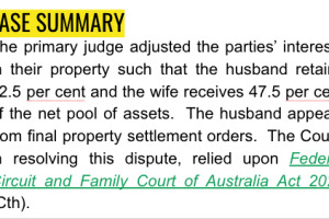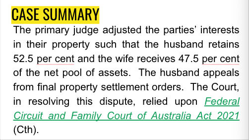 The primary judge adjusted the parties’ interests in their property such that the husband retains 52.5 per cent and the wife receives 47.5 per cent of the net pool of assets. The husband appeals from final property settlement orders. The Court, in resolving this dispute, relied upon Federal Circuit and Family Court of Australia Act 2021 (Cth).
