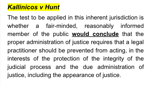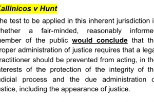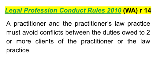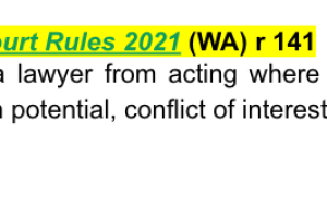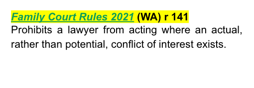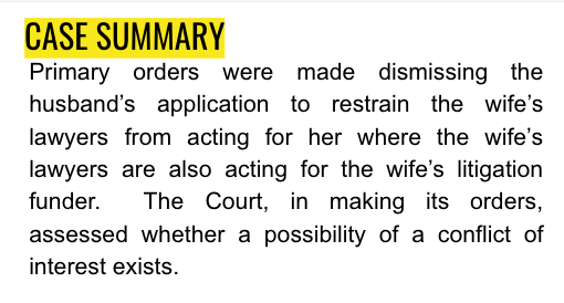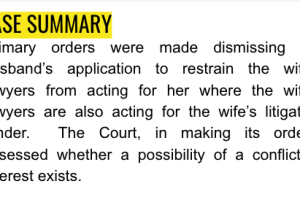 Primary orders were made dismissing the husband’s application to restrain the wife’s lawyers from acting for her where the wife’s lawyers are also acting for the wife’s litigation funder. The Court, in making its orders, assessed whether a possibility of a conflict of interest exists.